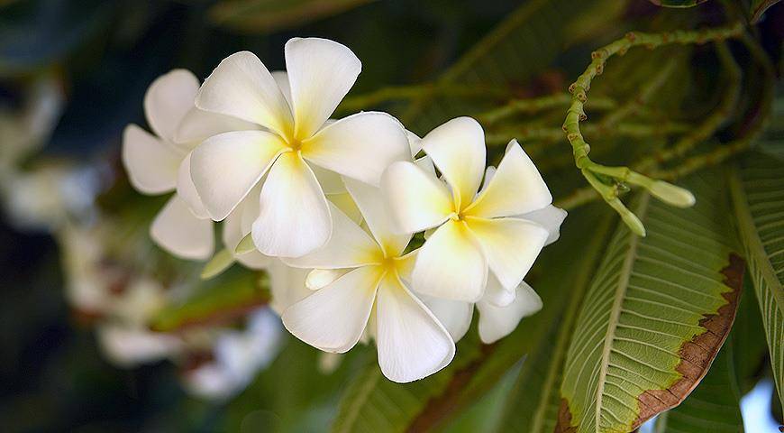 Карисса крупноцветковая (Carissa grandiflora) , ее иногда называют “комнатная слива” за плоды, напоминающие по вкусу сливу. Симпатичный здоровый кустарничек с блестящей листвой, которому необходима прищипка для компактности и ветвления.Калотропис гигантский (Calotropis gigantea) – быстрорастущее растение родом из Юго-Восточной Азии со светлыми опушенными листьями и цветами, напоминающими с одной стороны восковые цветы хойи, с другой эмалевое украшение в стиле модерн. Есть у него и белоцветковая форма.Плумерия (Plumeria). Тоже отличается стремительным ростом и невероятным ароматом цветов, дождаться которых не так-то просто (при хороших условиях на третий-четвертый год). Цветы по форме напоминают пропеллер. Огромные листья при понижении температуры ниже 15 °С опадают. Требует много места, правда, есть карликовые сорта.