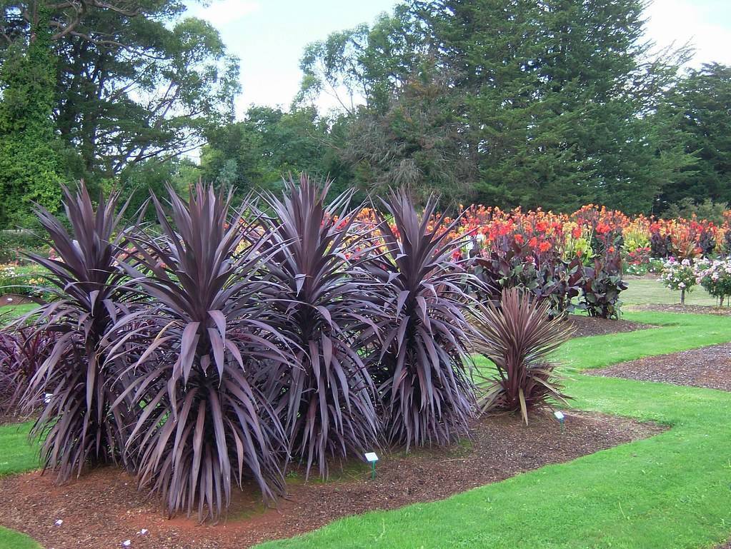 Заслуживает внимания средних размеров кордилина Киви с вытянутыми узкими плотными сочными листьями, окаймленными ободком розовых или желтых тонов. Из центра появляется фиолетовое соцветие. Этот вид широко используется при создании ландшафтных композиций из-за особой морозостойкости.