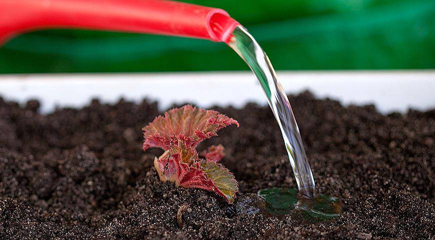 Большинство сортов бегонии спокойно переносят кратковременную засуху, а чрезмерное увлажнение чаще всего приводит к какому-нибудь заболеванию, а то и к гибели цветка. Декоративно-лиственные сорта бегоний с мочковатыми корневищами следует поливать регулярно и обильно в весенне-летний период их роста. А вот клубневые виды следует поливать умеренно, не раньше, чем наполовину просохнет грунт в горшке после предыдущего полива. Для этого используйте только мягкую воду (кипяченую, отфильтрованную или отстоянную в течение суток), чтобы исключить вредные примеси. В зимнее время года полив существенно сокращайте, воду из поддона сразу же сливайте. Клубневые виды не поливайте совсем.
