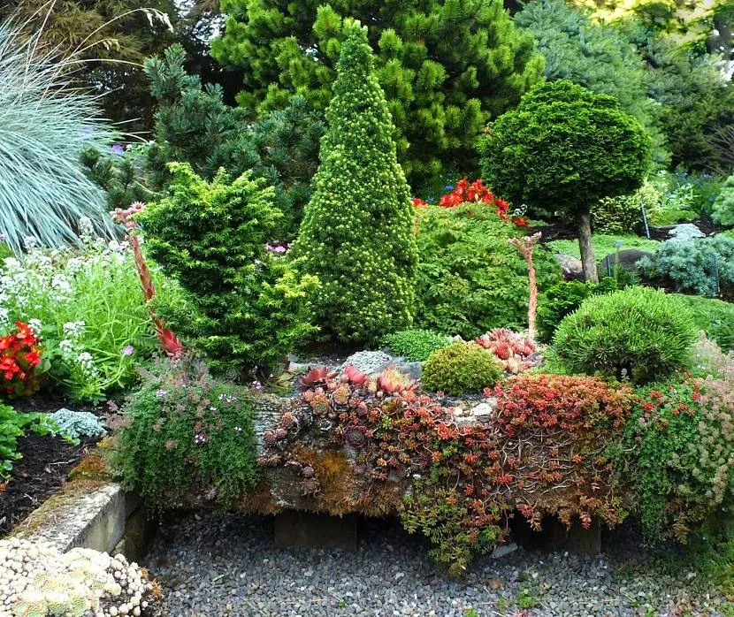 - Садовые композиции. Аккуратный абрис ели коники станет подходящим украшением каменистого сада (альпинария или рокария). Елочка превосходно смотрится в сочетании с цветами, хостами, злаковыми, самшитом и барбарисом Тунберга, чья листва окрашена в золотисто-желтый или красный цвет.