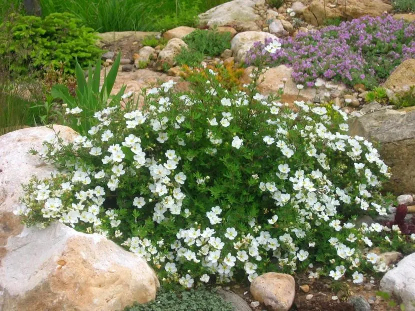 | Абботсвуд (Abbotswood). Густой, прямостоячий сорт лапчатки, растущий до 1 метра высотой. Белые цветы долго сохраняются на кустах, лучше выращивать на солнечных позициях. | ![]() |