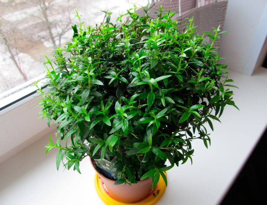 «Microphylla» — этот сорт мирта довольно обычен по окраске, молодые листья светло-зеленых тонов, в то время как более взрослые приобретают темно-зеленый окрас. Сорт относится к карликовым, его высота не будет достигать и 60-70 см в высоту.
