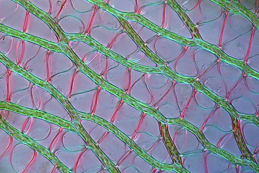 Мелкие листья сфагнового мха – однослойные. На них присутствуют два типа клеток: хлорофиллоносные, живые, и гиалиновые, мертвые. Гиалиновые – крупные, имеют ромбовидную форму, содержат внутри спиралевидные или кольцеобразные образования из гиалина. Он является гигроскопичным веществом, и благодаря этим структурам мертвые клетки сфагнума способны поглощать и накапливать в себе воду. Водоносные клетки составляют 2/3 поверхности листьев. Вокруг каждой из них расположено по 4-6 живых, хлорофиллоносных, выполняющих традиционную для растений функцию фотосинтеза. Верхушки сфагнума могут иметь различную окраску, от зеленой до красноватой или бурой, и выглядят очень живописно. Специалисты связывают различия в окраске с погодными условиями.