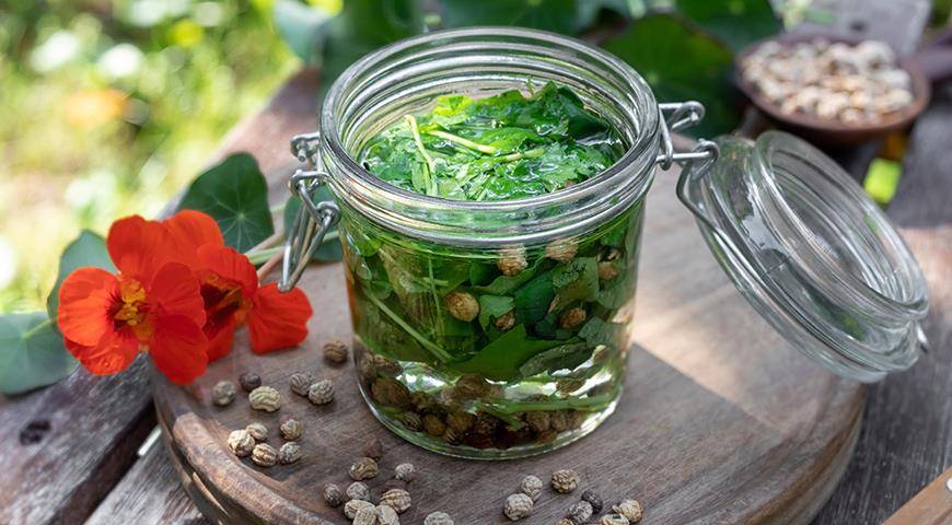 400 г свежесобранных листьев настурции и 200 г корня хрена пропустите через мясорубку. Заложите в стеклянную банку или эмалированную посуду, добавьте примерно 80 г сахара и залейте кипяченой водой (1 л). Настаивайте напиток примерно 12 часов, затем процедите, охладите и подайте к столу. У напитка остро-пряный, довольно необычный вкус.