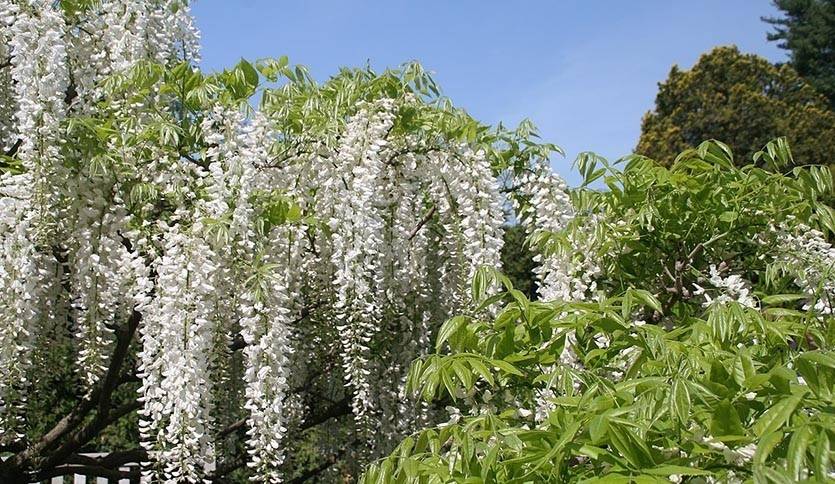 - ‘Alba’ — с белыми соцветиями, иногда с розовинкой, длиной до 60 см. Часто именно белоцветковые формы называют глицинией японской, а окрашенные в другие цвета — глицинией обильноцветущей.