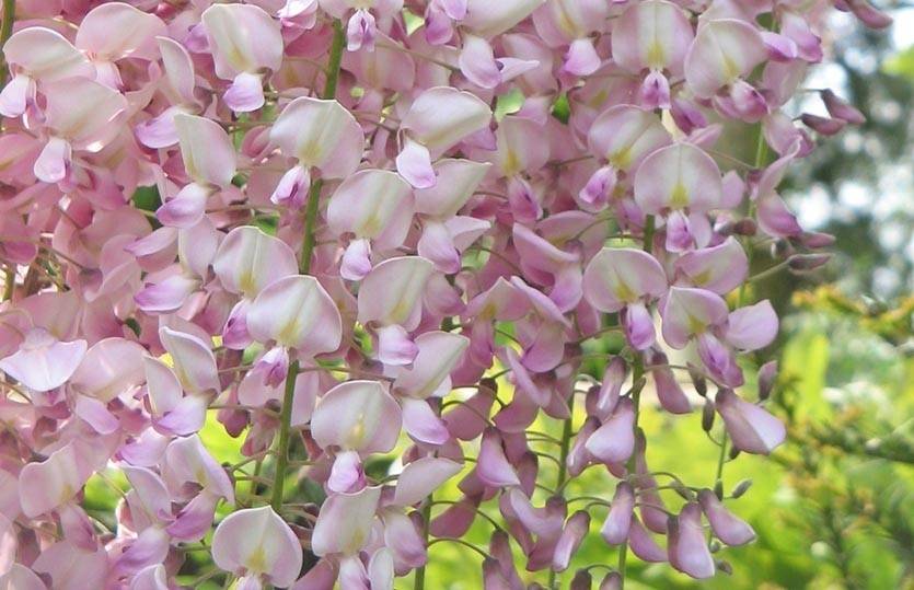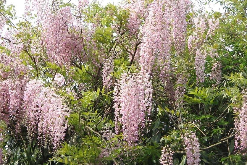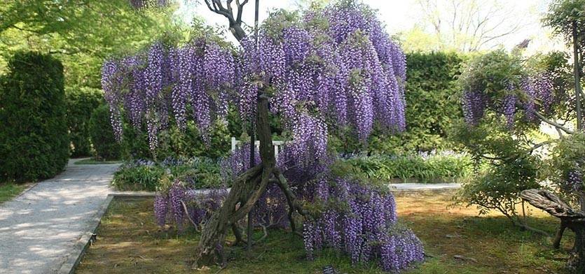 - ‘Multijuga’ — с лилово-голубыми соцветиями до 1 м! Причем при ку́польной формировке кроны периферийные соцветия свисают до самой земли, подобно царскому шатру.