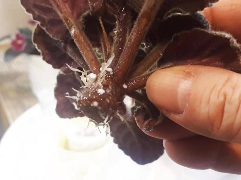 - Очистить корешки от старой почвы и внимательно осмотреть фиалку, особенно в середине.