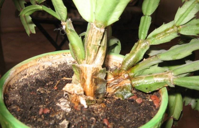 Если Декабрист не успевает «выпивать» воду, она начинает застаиваться и образовывать так называемое болото. В условиях холода корневища начинают гнить, а при сильной жаре корни просто преют либо же сгорают. В том или ином случае подземная часть растения перестает нормально функционировать и не может полноценно обеспечивать надземную часть цветка. От этого и приходят в упадок листовые пластины.