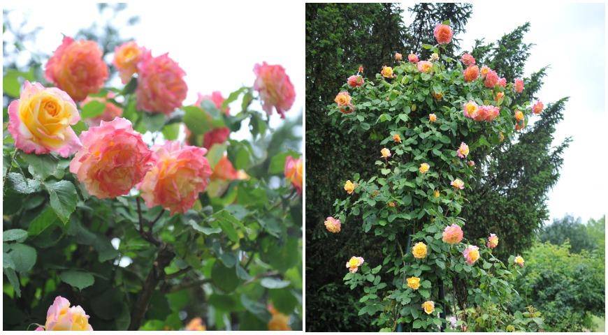 Многие экземпляры этого сорта проявляют признаки плетистой розы, поэтому их часто выращивают на обелисках. Цветки яркие, лососевого оттенка, интересной формы. Куст вырастает до 2 -2,5 м, устойчив к заболеваниям.