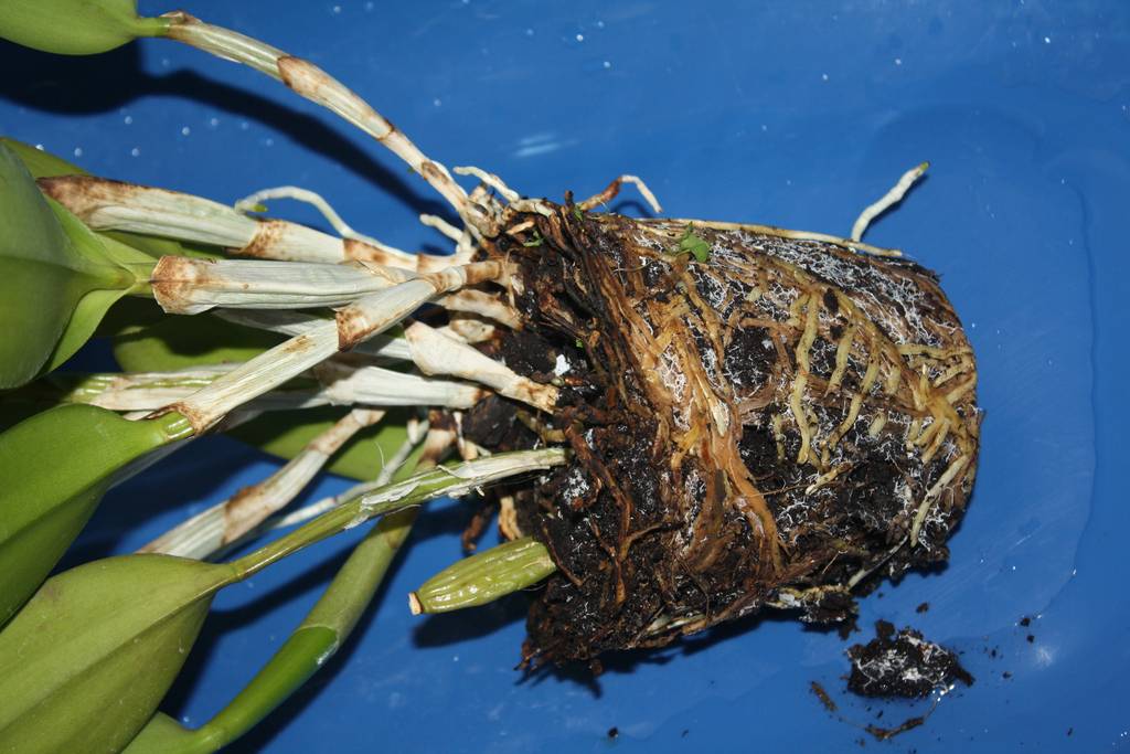 - Сухие, гнилые и поврежденные корни при пересадке обрезают острым секатором, а места срезов обрабатывают толченым древесным углем.