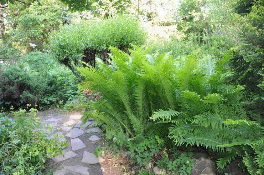 Можно сказать, что сочетание папоротников в саду возможно с любыми теневыносливыми растениями: хостами, астильбой, снытью и т.д.