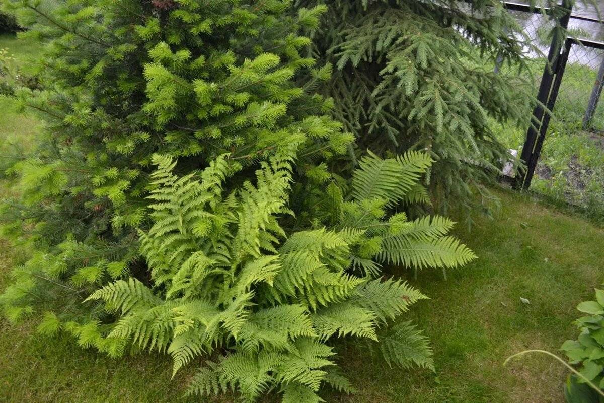 Садовый папоротник особенно красиво смотрится в саду и паре с хвойными деревьями