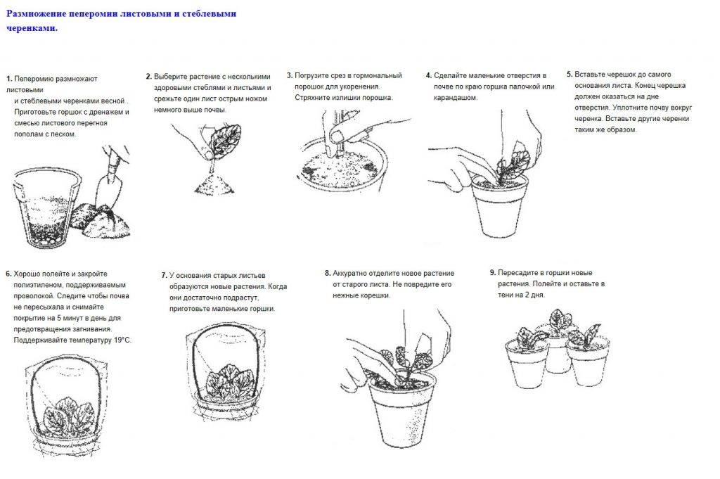 Размножаются пеперомии легко: при помощи листовых, стеблевых черенков, делением куста. Укореняют в воде или смеси перлита, песка и торфа (1:1:1).