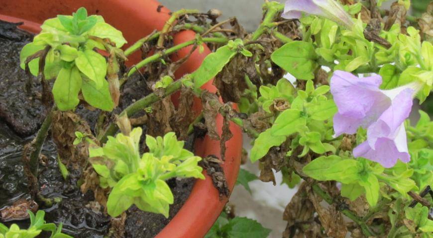 Петуния, посаженная на клумбе или в балконном ящике, негативно реагирует на изменение внешних условий. При резком падении температуры, длительной сырой погоде цветы поражаются фитофторозом. Болезнь начинает развитие в нижней части побегов, затем гниет весь стебель, и за несколько дней петуния погибает. Спасти растение не удается, но предупредить появление фитофтороза помогает обработка земли и емкостей для цветов медным купоросом, фунгицидами «Ридомил», «Профит».