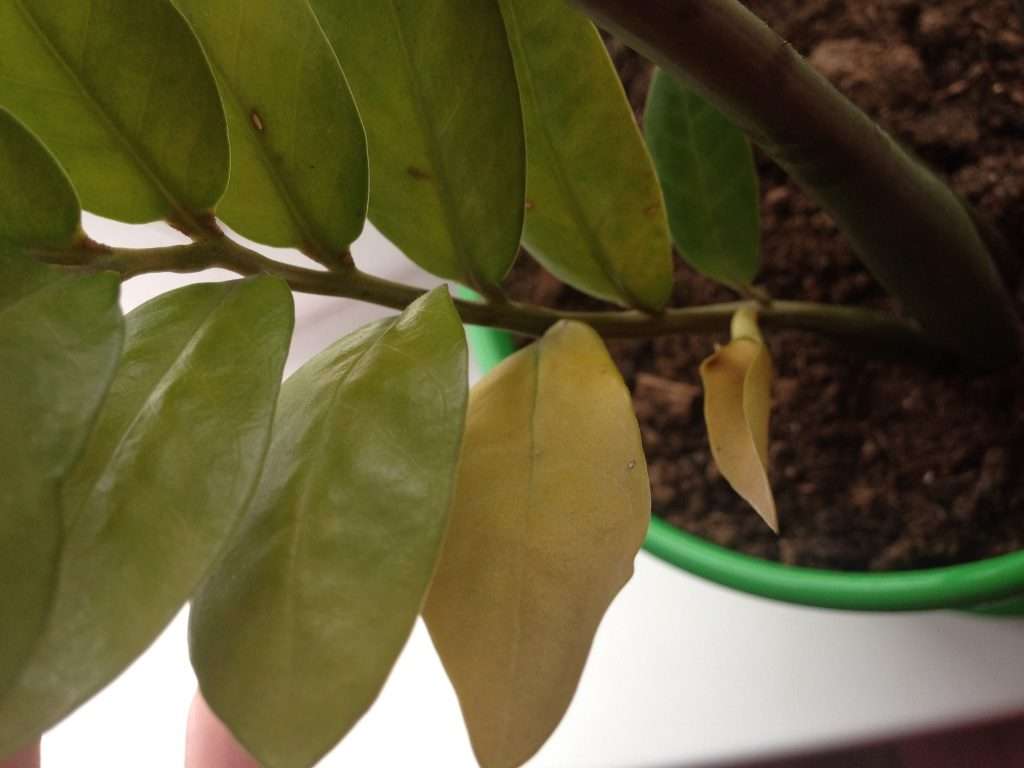 Если желтеют листочки на молодых побегах или замиокулькас желтеет полностью, стоит обратить внимание на то, как вы за ним ухаживаете: