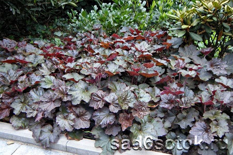 Краснолистные сортовые гейхеры выделяются листьями с красноватыми, багряными, бордовыми, вишневыми оттенками: