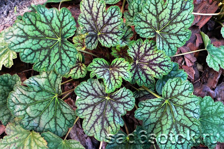 Произрастающая на берегах Великих Озер. В США ее называют горная герань. Привлекает своими листьями, образующими розетку высотой около 20 см. С нижней стороны листья коричнево-лилового цвета, по форме сердцевидные, округлые, черешки длинные. Метелки на цветоносах 50-60 см высотой состоят из желто-зеленых цветков. Грин Спайс – один из красивейших сортов гейхеры американской с зелеными листьями и контрастными серебристыми пятнами по ним. В течение вегетации листья изменяют оттенки зеленого цвета от более желтого к более темному, пятна серебра увеличиваются, а вокруг жилок появляется пурпурный оттенок.