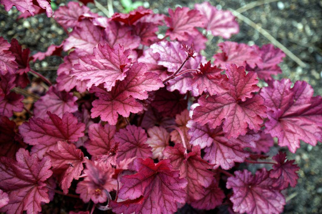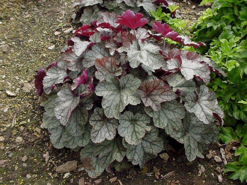 Спустя некоторое время листва будет плотной и тёмной, но сначала полупрозрачной с насыщенным цветом. Гейхера может сочетается с примулой, лилейником, астильбой и другими декоративными злаками.