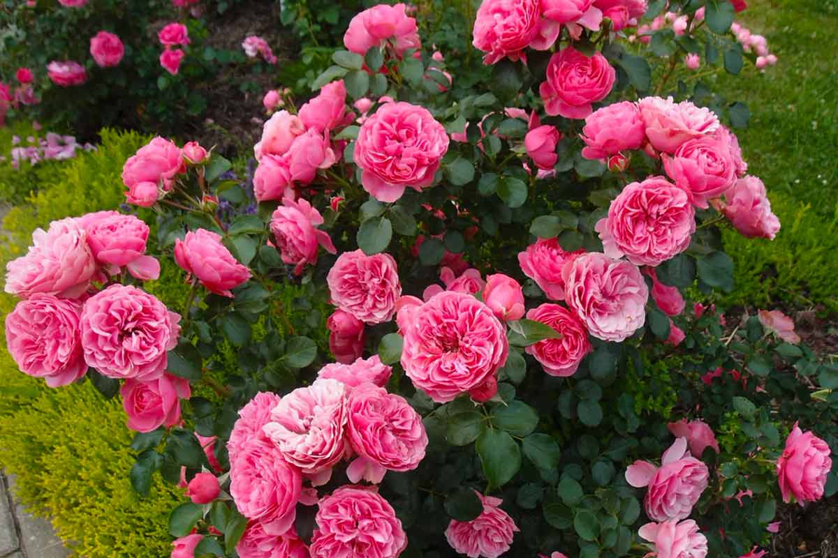 В ландшафтном дизайне стильно смотрятся английские розы. Выращивание цветов не составит труда, хоть и потребуется изучить все сорта, а на рынке представлены все новые и лучшие варианты. Классикой считаются розы William Shakespeare, Benjamin Britten, Graham Thomas, Abraham Darby, Scepter Isle. Положительные отзывы о Роуз Грейс, Селебрейшен Голден, Дерен Элегантиссима. Все они известные шрабы. Используя правильное сочетание сортов можно создать стильный котовник или ковер из цветов.