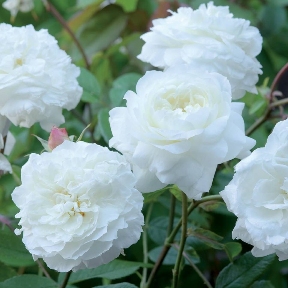 Компактным кустом обладает английская роза Глемис Касл (Glamis Castle). Цветы у розы белые с кремовым оттенком. Они густомахровые (более120 лепестоков) и появляются на прояжении всего лета. При очень низких температурах требует укрытия и может поражатся мучнистой росой или пятнистостями. Для предупреждения появления грибковых заболеваний применяют профилактические опрыскивания. Как и все розы, предпочитает нейтральные почвы с хорошим дренажом. Плохо переносит тяжелые глинистые почвы. В затянувшиеся дожди цветки не раскрываются. Ветви усыпаны колючками, но нежные, хрупкие. Размер цветка при должном уходе достигает 10см. Запах классический, миртовый.