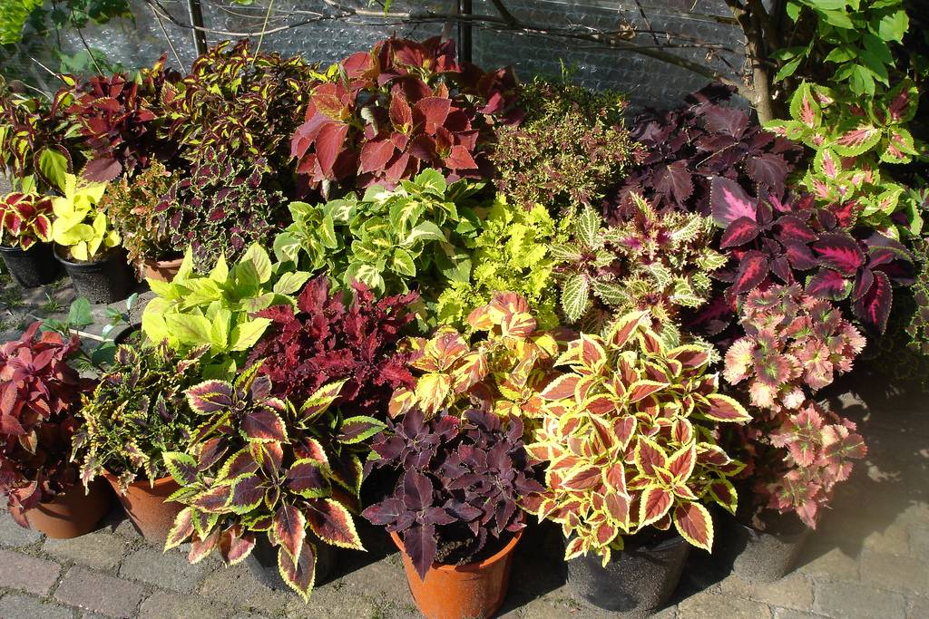 Можно вырастить колеус самых необычных оттенков, порадуют сиреневые, фиолетовые, коричневые, малиновые и прочие цвета. Расцветки не однотонные, могут идти с кантом по краям листа, иметь полосы, пятна. В природе встречается более 60 видов, селекционеры вывели немалое количество пестрых гибридов.