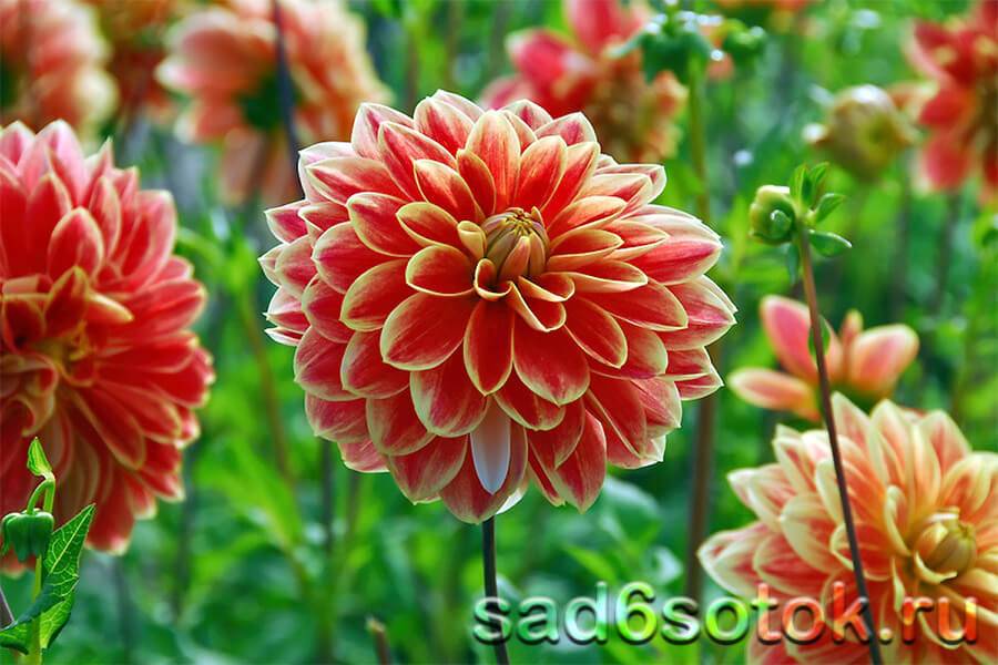 Осенью в каждом цветнике встречаются разноцветные пышные георгины. Существует много сортов этого крупного растения. Они отличаются высотой куста, размерами цветка, окраской.