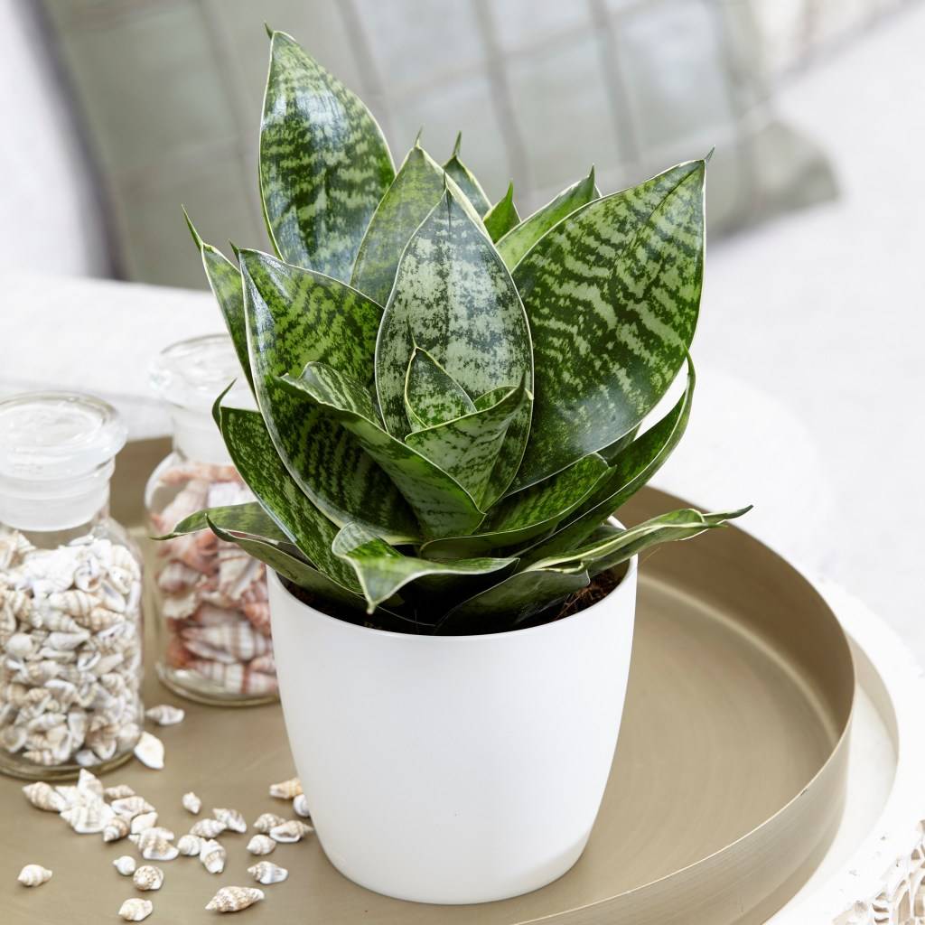 Цветок в стиле минимализма – выглядит очень аккуратно,без лишних деталей. Прямые листья конической формы имеют темно-зеленый окрас и собраны в компактные прикорневые розетки. Цветы также не выбиваются из общей концепции, так как они имеют маленький размер и спокойный кремовый цвет. «Тёщин язык» этого вида не прихотлив в домашнем уходе, поэтому подойдет даже тем людям, которым приходится часто и надолго уезжать из дома.