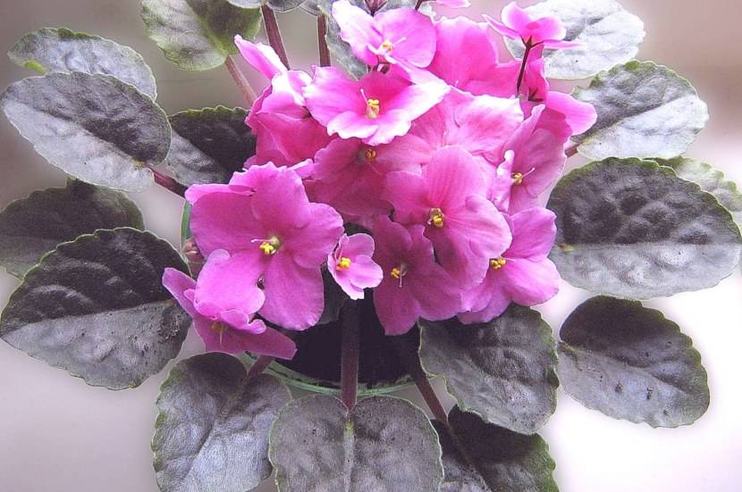 Зеленые «стеганные» листовые пластины формируют небольшую компактную розетку. Фиолетовые цветки имеют беловатое окаймление. Продолжительность жизни одного цветка составляет примерно 8 недель.
