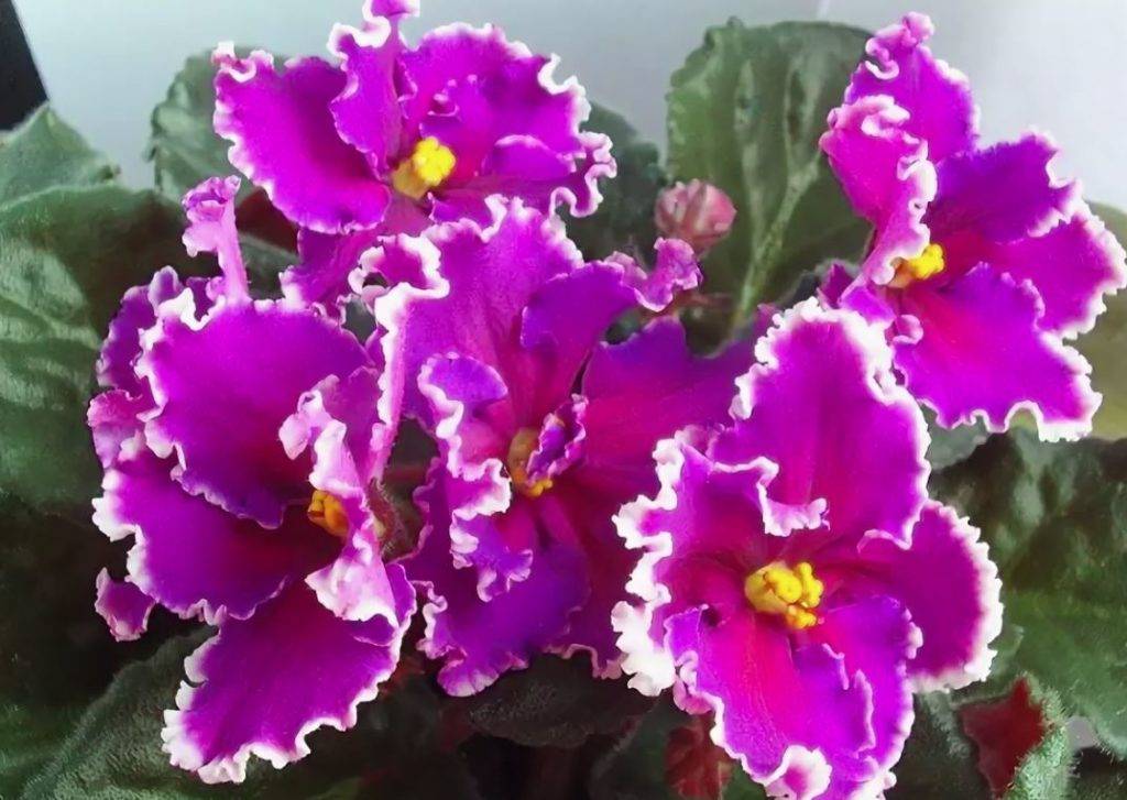 Цветки выделяются очень большим размером. Ближе к центру лепестки обладают бордовым окрасом, а по краям они фиолетовые. Окаймление у них белесое и махровое. Цветет долго, но не сильно пышно. Немного волнистые листовые пластины обладают темным зеленым окрасом.
