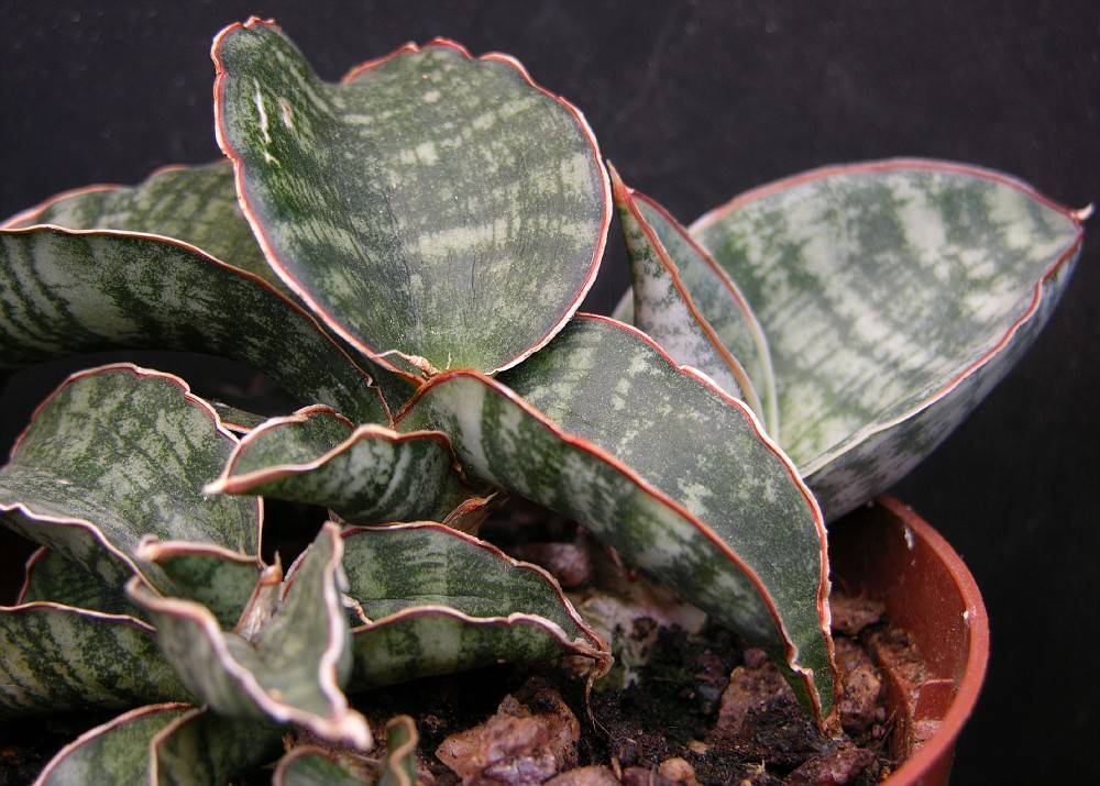 Сансевиерия Кирка удачно вписывается в любой интерьер. Имеет немного листовых розеток, украшенных светлыми пятнышками и коричнево-красной окантовкой. Встречаются коричневые и красноватые цветки.