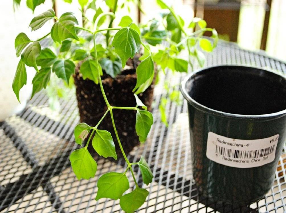 Пересадка растения проводится тогда, когда корни полностью заполнят контейнер. Слишком частые пересадки нервируют радермахеру и она может сбрасывать листья. Но это временное явление. Надо создать ей оптимальные условия и она опять возобновит свою красу. Для достижения цели следует укоротить ветки на половину, сократить полив, чтобы опять-таки не появилась корневая гниль (у растения стресс), обеспечить яркое рассеянное освещение.