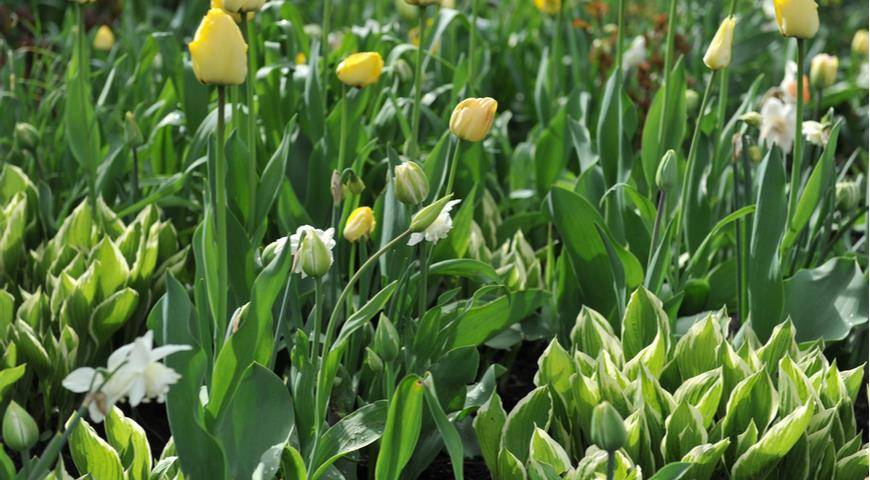 Воспользуйтесь тем фактом, что хосты появляются поздно, и засаживайте большие открытые пространства луковицами весеннего цветения и первоцветами. По мере того, как раноцветущие растения отмирают, вновь появляющиеся листья хосты скроют их из виду. Подснежники, миниатюрные нарциссы, прострелы, тюльпаны, хохлатки – хорошие спутники хосты.