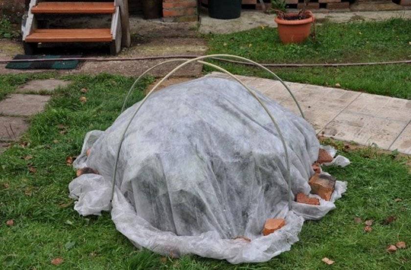 Под корень насыпают садовой земли, а сверху закрывают хвойным опадом или ветками ели. Растение во весь рост должно быть укрыто. Желательно соорудить какое-либо ограждение в виде пластиковых трубок, вкопанных в землю, чтобы на него можно было закрепить утеплитель – лутрасил или агроволокно в два слоя.