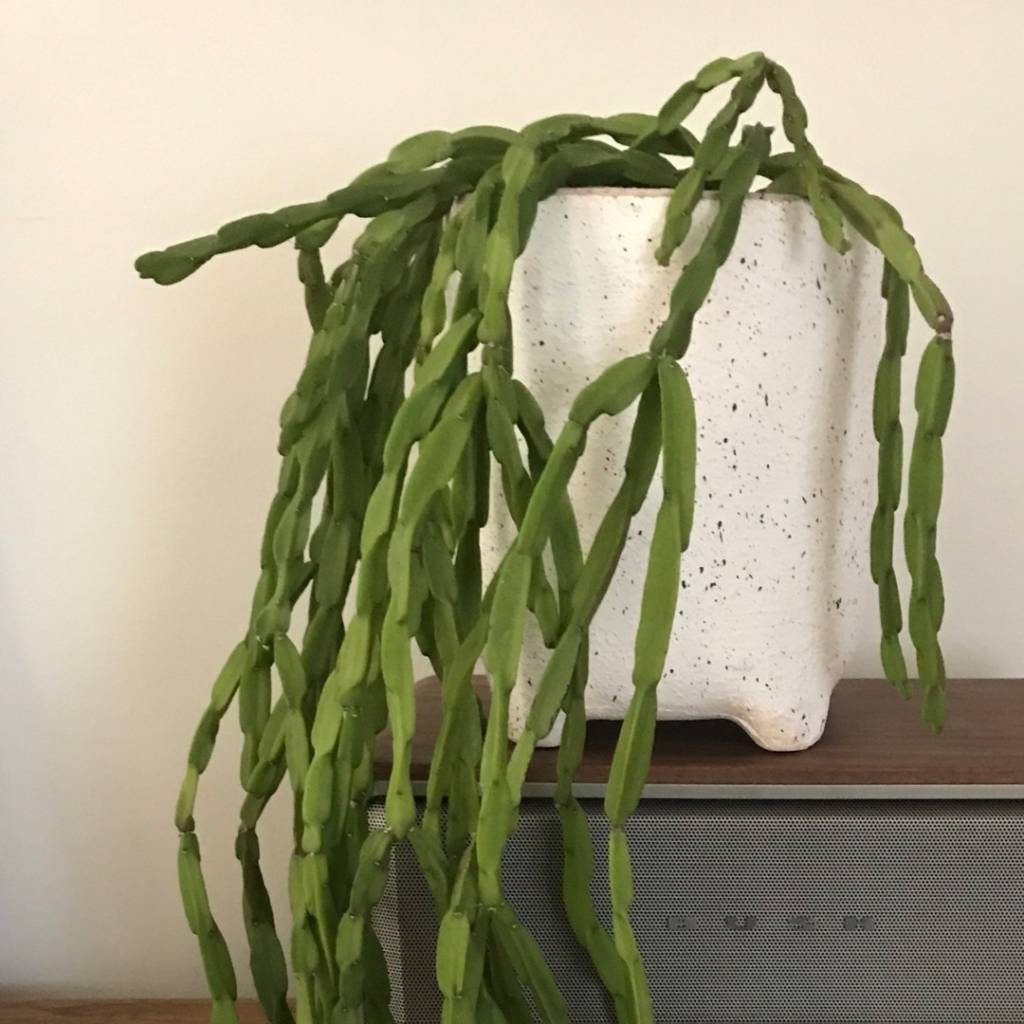 Этот кактус представлен в форме кустарника, при этом его поникающие побеги окрашены в зеленый цвет. Растение невысокое — примерно 20–25 сантиметров. По сравнению с другими видами сегменты у него самые узкие и длинные. Их ширина примерно 20–25 мм, а длина — до 70–80 мм. На кромке каждого сегмента есть закругленные выступы в количестве 3–4 штук. Ареолы располагаются на выступах самых верхних члеников, на них имеется опушение, состоящее из ворсинок коричневого цвета.