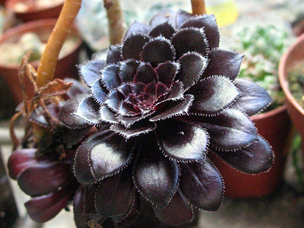 Эониум сам по себе похож на цветок, хотя таким образом у него расположены листья темно-бордового цвета с фиолетовым отливом.