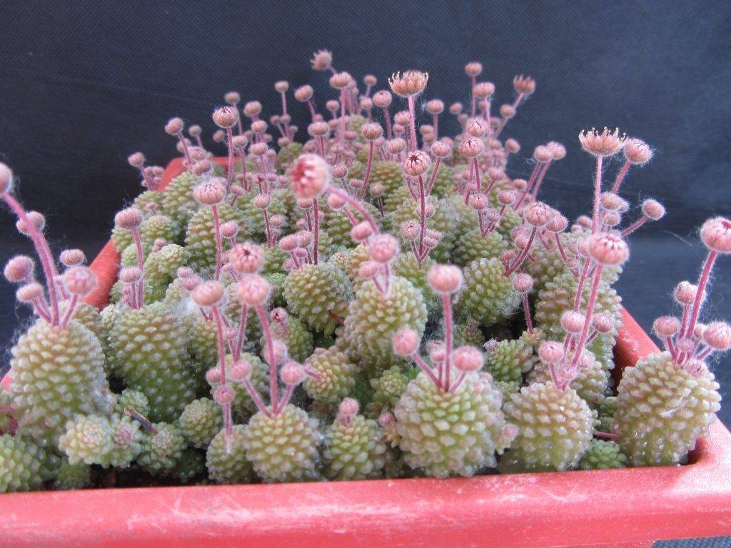 Монантес похож на еловые шишки, собранные вместе в горшке. Цветение «звездочкой» желтого оттенка на красном стебле.