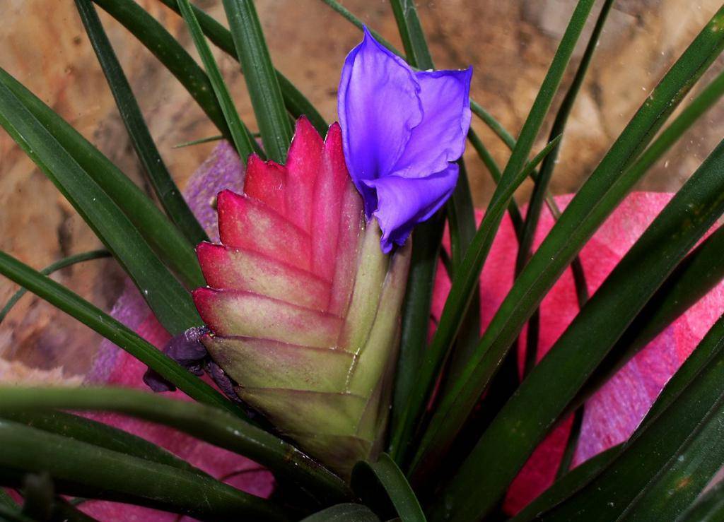 Красивый тропический цветок семейства Бромелиевые, с необычным колосовидным розовым соцветием, на котором летом появляются синие цветочки.