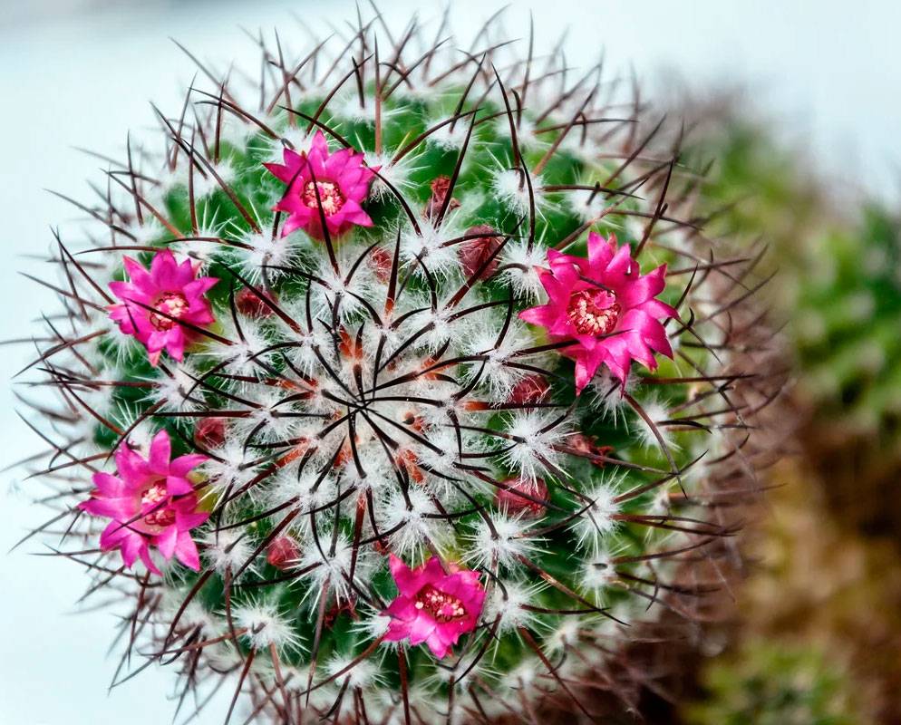 Мамиллярия выглядит как ровный шар с колючками разной формы – короткими, длинными, похожими на пух. Может вырасти до 40 см в диаметре. Цветет мелкими цветоносами, расположенными по окружности кактуса.