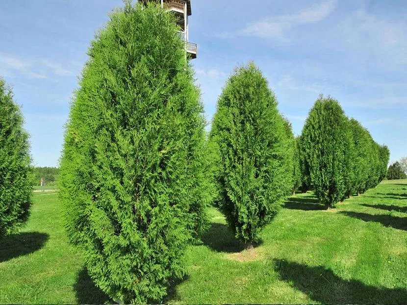 Смарагд – дерево с конической формой. Хвоя изумрудно-зелёная, крона плотная. Популярен в городах с умеренным климатом, потому что устойчив к нестабильной погоде. Скорость роста – от 15 до 25 сантиметров в год.