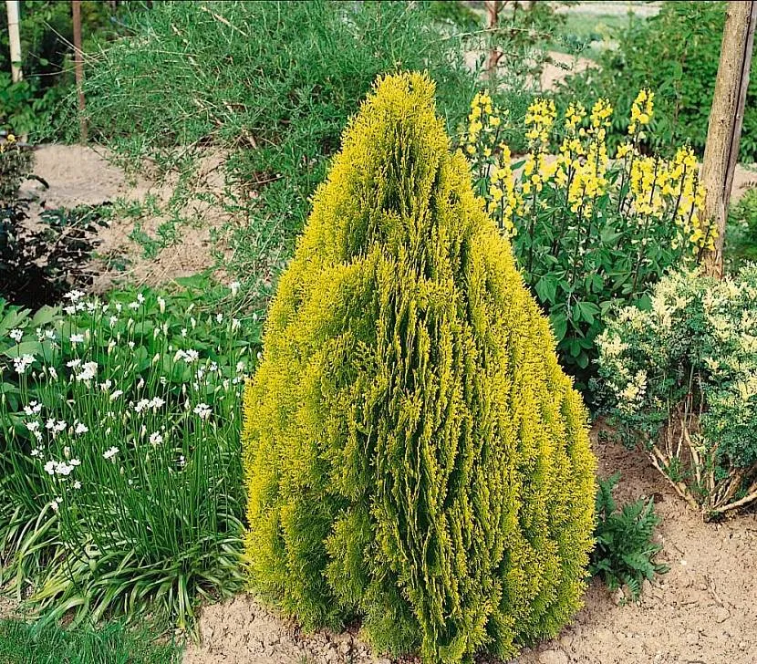 С возрастом туджа немного высыхает и распадается снизу. Чтобы скрыть этот раздражающий недостаток, вы можете посадить перед собой густо растущие кустарники (например, айвуары).