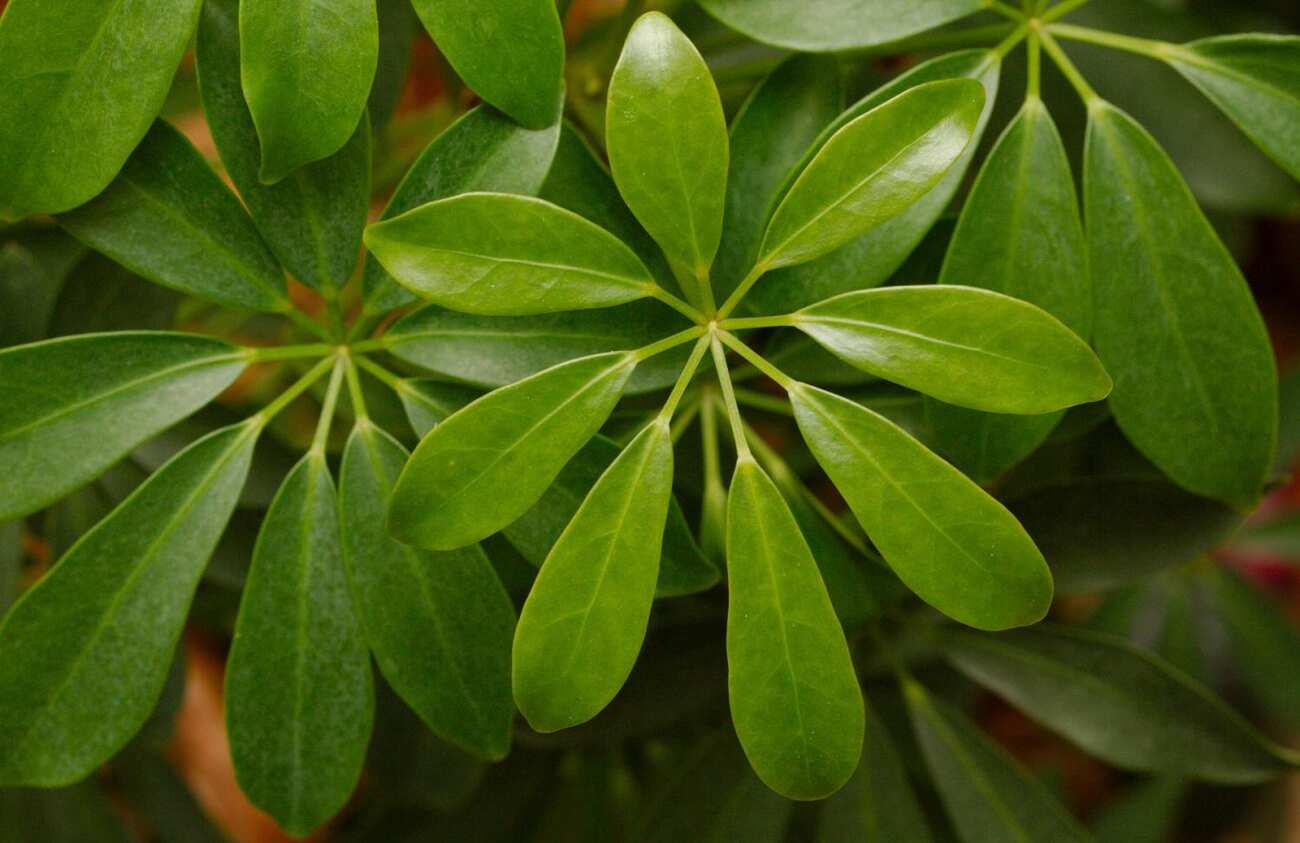 Листья шеффлеры пальчатой тонкие и мягкие на ощупь. Они разделены на 3-9 частей, каждая из которых имеет овальную форму с зазубренными краями. Растение неприхотливо и подходит для выращивания в домашних условиях.