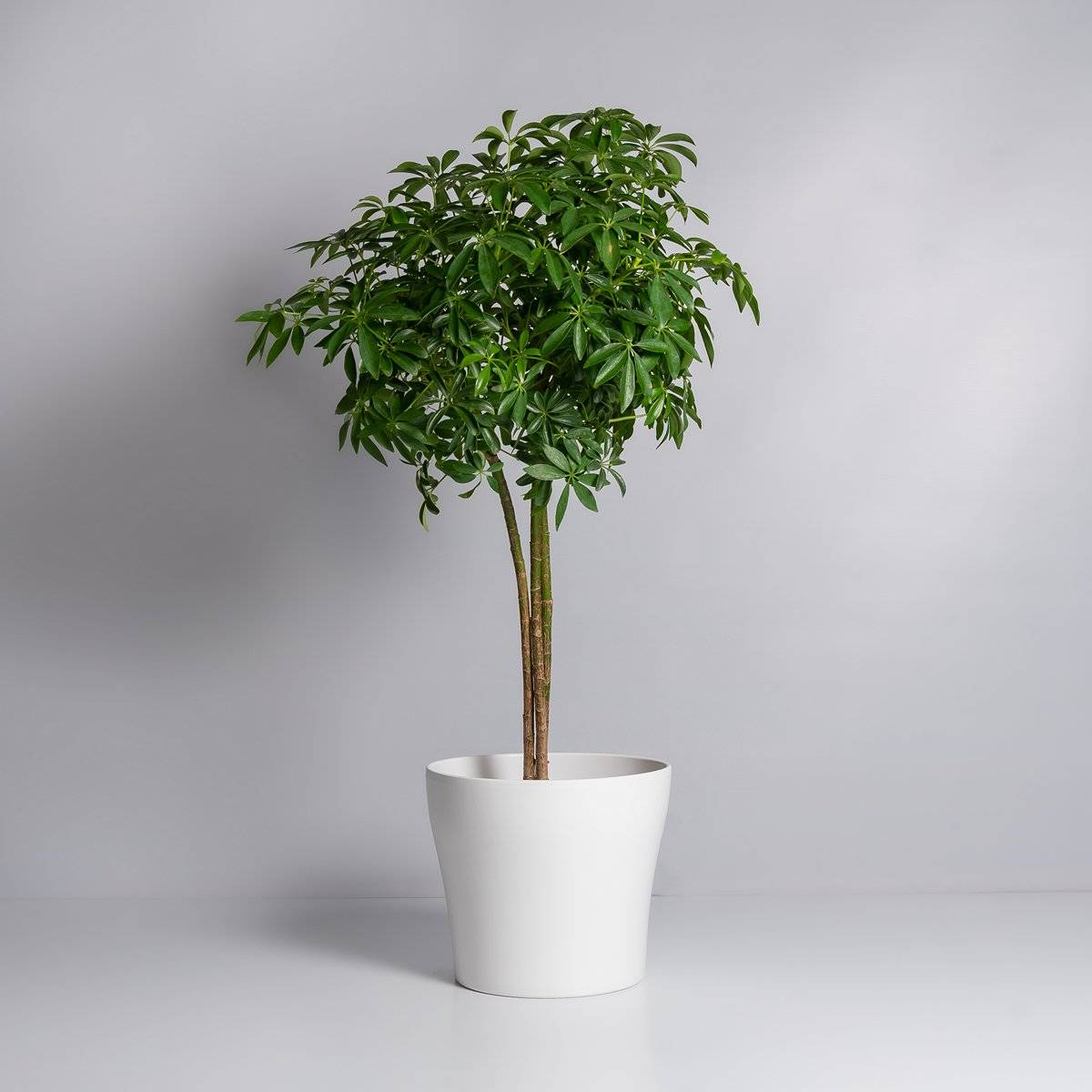 Это один из самых популярных видов растения. Он имеет ярко-зеленую или изумрудную листву, однотонную или с желтовато-бежевыми вкраплениями. В природе это лиана, растущая до 40 метров, тогда как в домашних условиях это растение достигает всего 2 метров в высоту. В культуре шеффлера древовидная отличается изяществом и компактной формой.