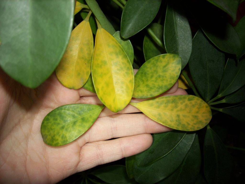 В этом случае очень важно быстро и правильно определить причину заболевания — скорее всего, дело в неправильном уходе или вредителях. Основные болезни шефлеры:. Листья шефлеры желтеют