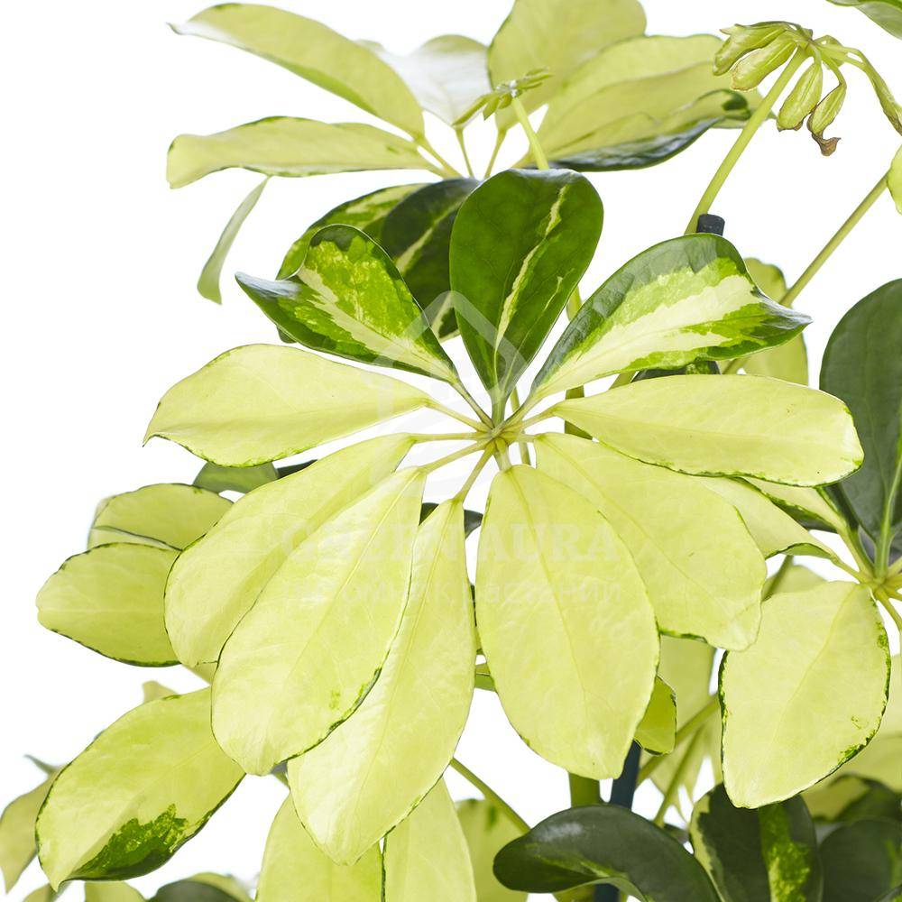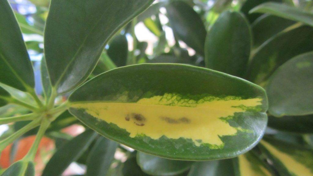 Обычно листья шефлеры желтеют от недостаточного освещения. В этом случае растение необходимо поставить ближе к источнику света, но не допускать попадания на листья прямых солнечных лучей — от этого на них могут появиться белые пятна.