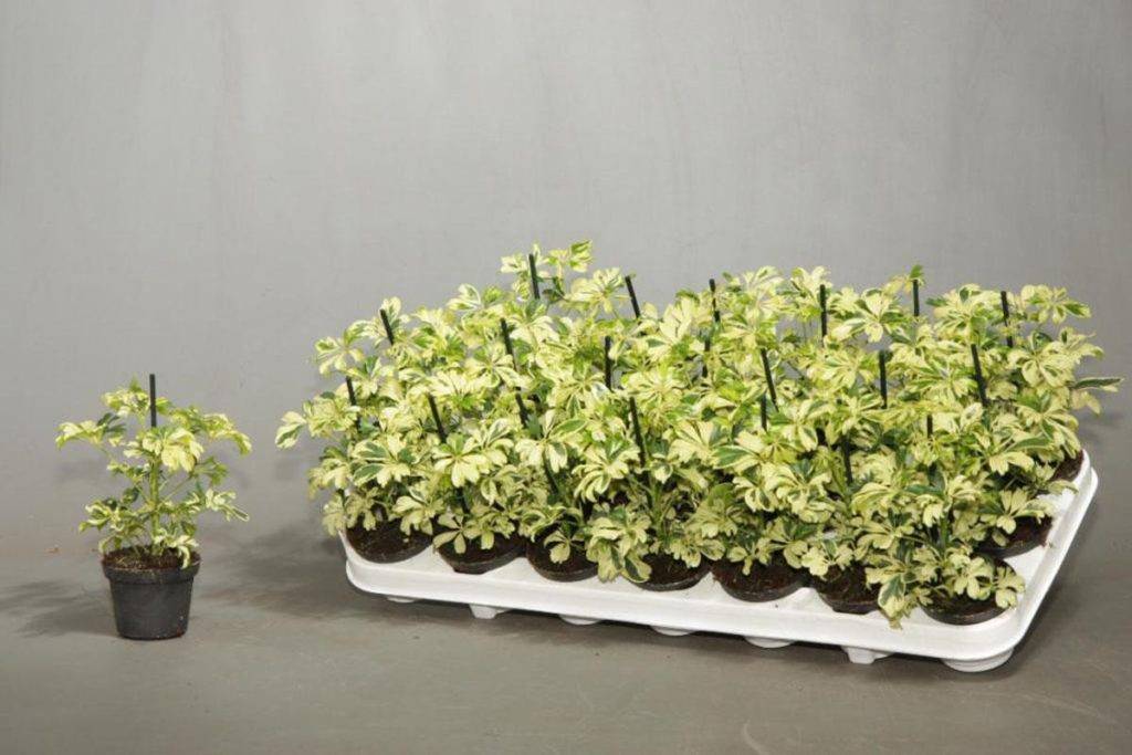 Если листовки длиннее 10-13 см — это Schefflera actinophylla. В противном случае это Schefflera arboricola. Уроженец тайваньских лесов, Schefflera arboricola может расти на открытом воздухе 8-9 м, хотя обычно он достигает высоты 2-3 метров в помещении. Есть карликовые версии, популярные для бонсай, которые остаются намного меньше. Schefflera actinophylla происходит из лесов Австралии, Новой Гвинеи и Явы. Это самый крупный из двух видов, способный достигать высоты 15 м на открытом воздухе. Несколько пестрых типов обоих видов, с желтым, золотым или белым рисунком на листьях, также широко доступны. Оба эти растения токсичны для собак и кошек.