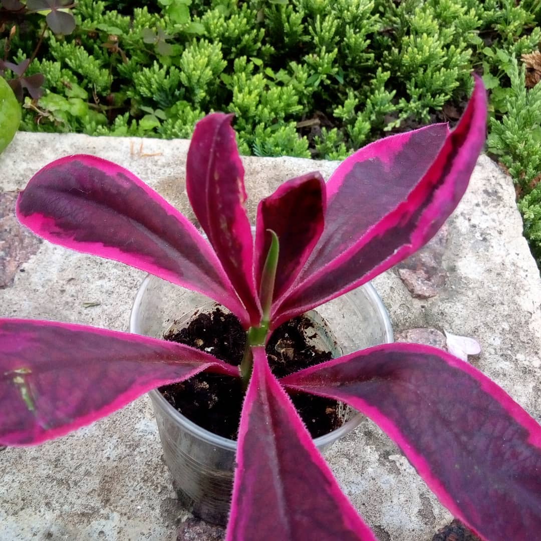 Это сортовой подвид синадениума Гранта. Отличительная особенность в том, что молодые листья и побеги имеют характерную розово-красную окраску, которая меняется, темнеет с возрастом. Листики у взрослых кутов темно-зеленые или бордовые с хаотичными темно-красными пятнами и прожилками.