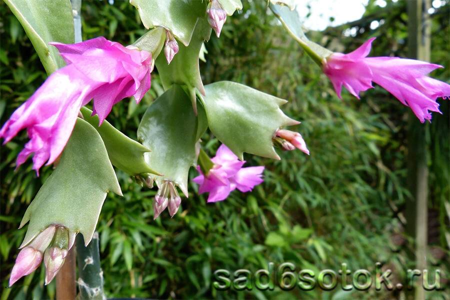 У этого вида побеги с крупными сегментами длиной до 7 см. Окраска цветков – светло-розовая или малиновая. Возможно повторное цветение в марте или в конце лета.