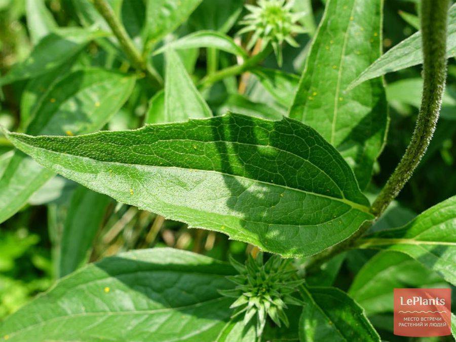 Известно 10 разновидностей растения, но в качестве культурного и лекарственного растения наиболее часто используется только эхинацея пурпурная и выведенные из нее гибриды. Это многолетник, достигающий высоты 1,2 м. Имеет прямостоячий шершавый стебель, на котором располагаются широкоовальные листья.
