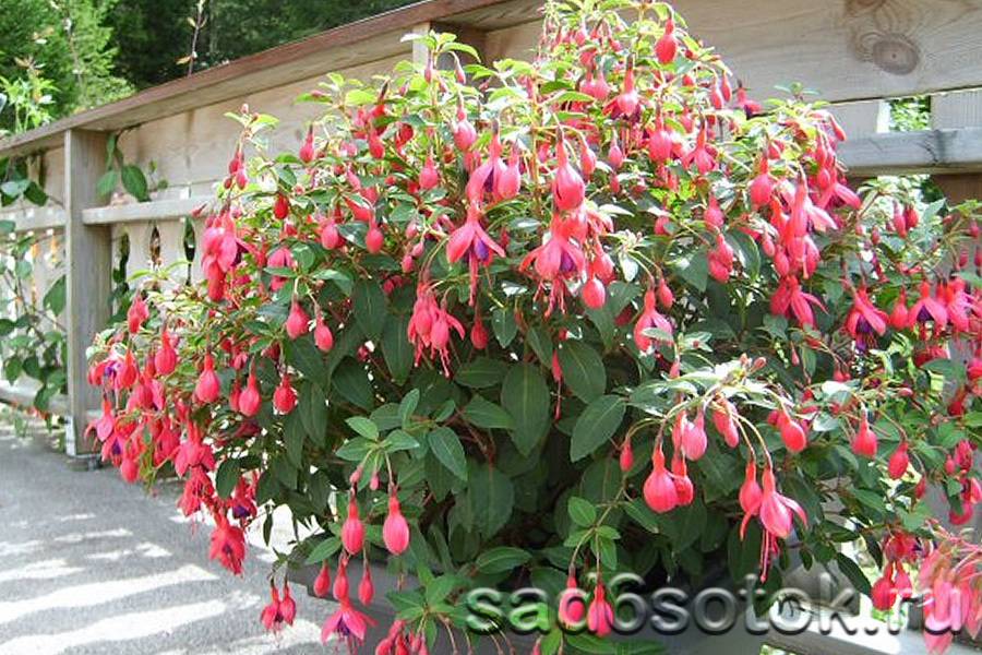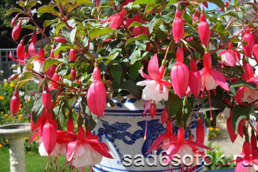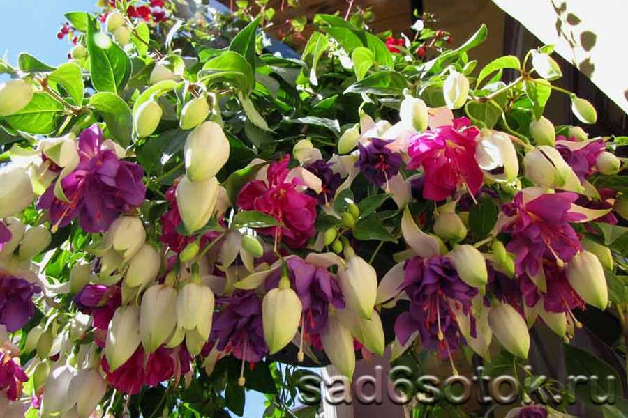 Длинные гибкие стебли ампельной фуксии свободно ниспадают, что дает возможность высаживать растения в кашпо, украшать ими веранды и террасы. Цветки средние или очень крупные, разнообразных оттенков, махровые, полумахровые и двухцветные. Для более пышного цветения в один горшочек высаживают несколько черенков.