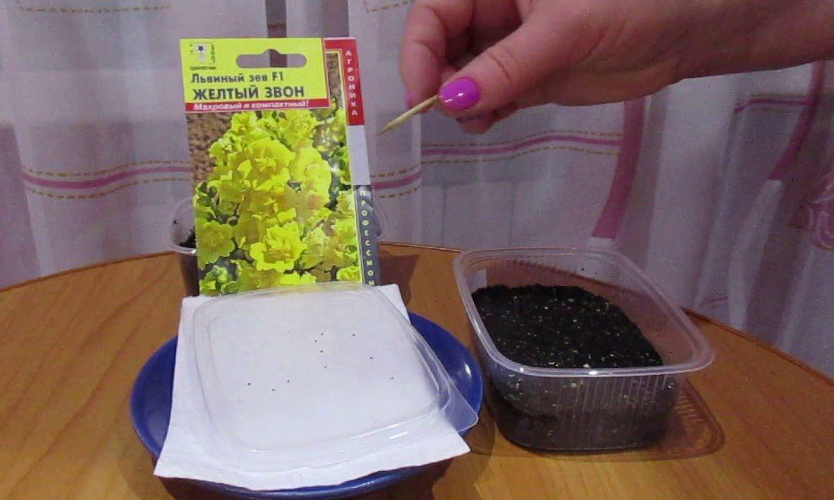 В более холодных районах львиный зев предпочтительнее выращивать путем рассады. Для этого в самом начале весны нужно провести посев семян. Для этого следует запастись небольшими плошками с дренажными отверстиями. На дно надо насыпать слой керамзита или мелкой гальки, а сверху засыпать торфяно-песчаной смесью. Так как семена слишком мелкие, к ним рекомендуется добавить немного крупного песка. После этого надо рассыпать их по грунту, слегка присыпать сверху почвой и сбрызнуть из пульверизатора. Посадки следует обернуть полиэтиленовой пленкой и отправить в хорошо освещенное место с температурой воздуха около двадцати пяти градусов. Укрытие нужно регулярно снимать для проветривания и полива. При таком содержании первые ростки появятся через две недели. После этого пленку надо убрать совсем.